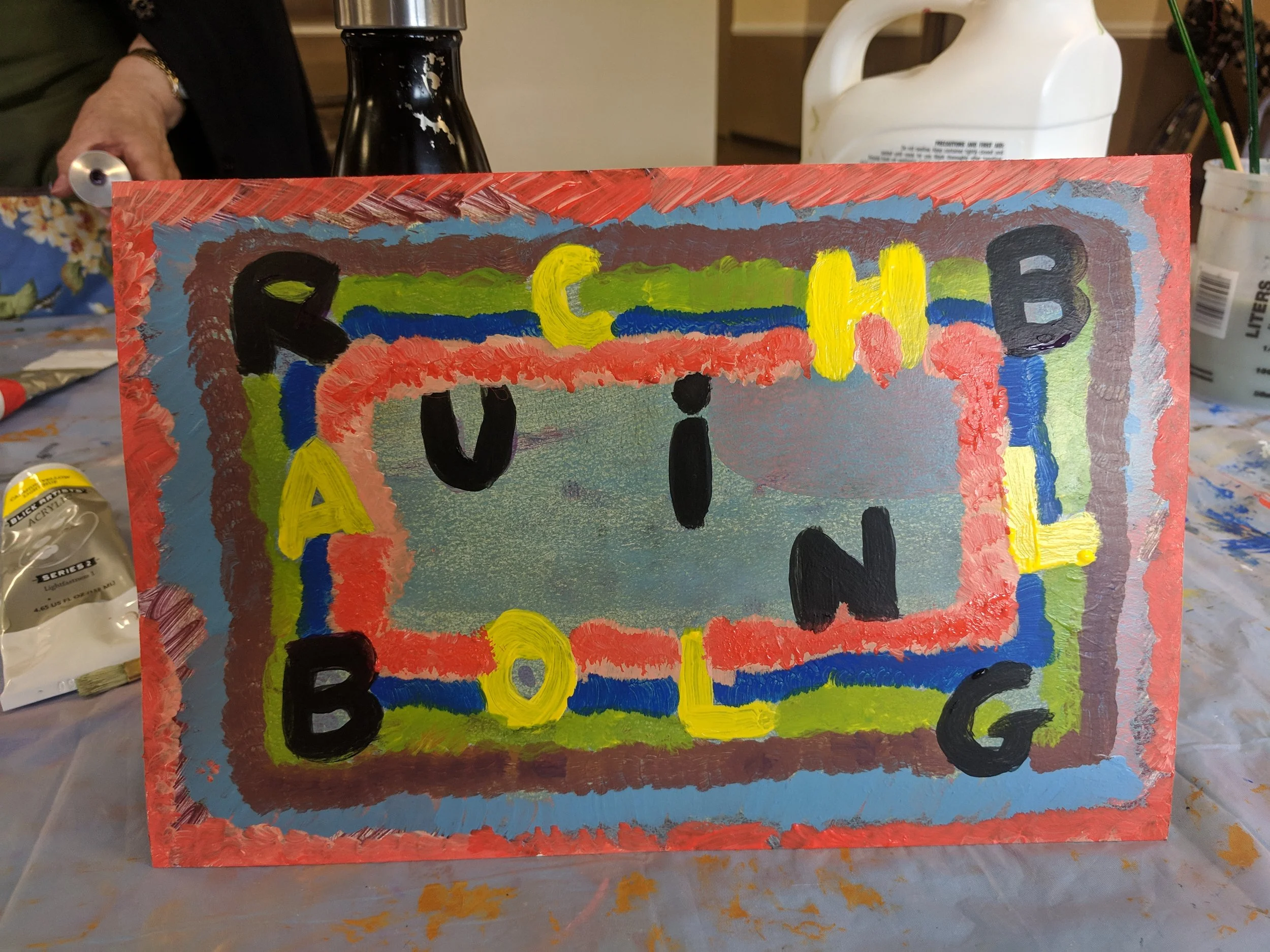 Participants create vibrant combinations of exploratory mark-making with other community residents, passing canvases back and forth every few minutes. We gather to enjoy the therapeutic benefits of creating visual art. Through collaboration, we aspire to cultivate conversation & enjoy time with neighbors.